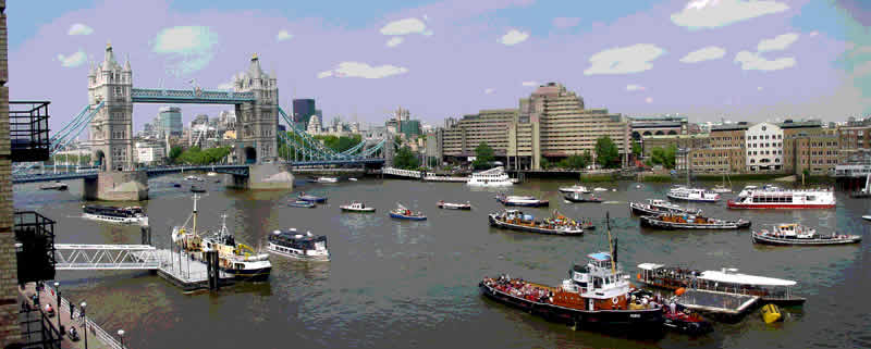 Honking, fog horns, barge rowing race, summer BBQs on the Thames, So much activity! This Image has lots of detail, the original is 1.5 MB.