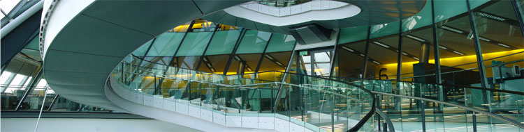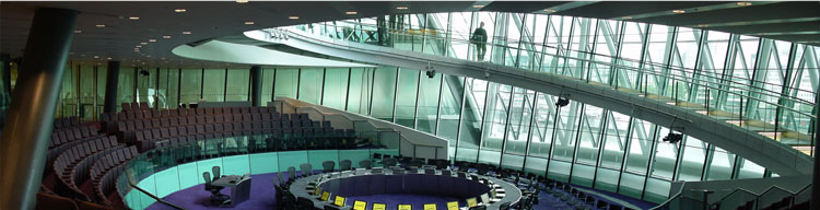 spiral stairs wind down above the council chambers and the interflow and weaving of shapes is very inspiring
